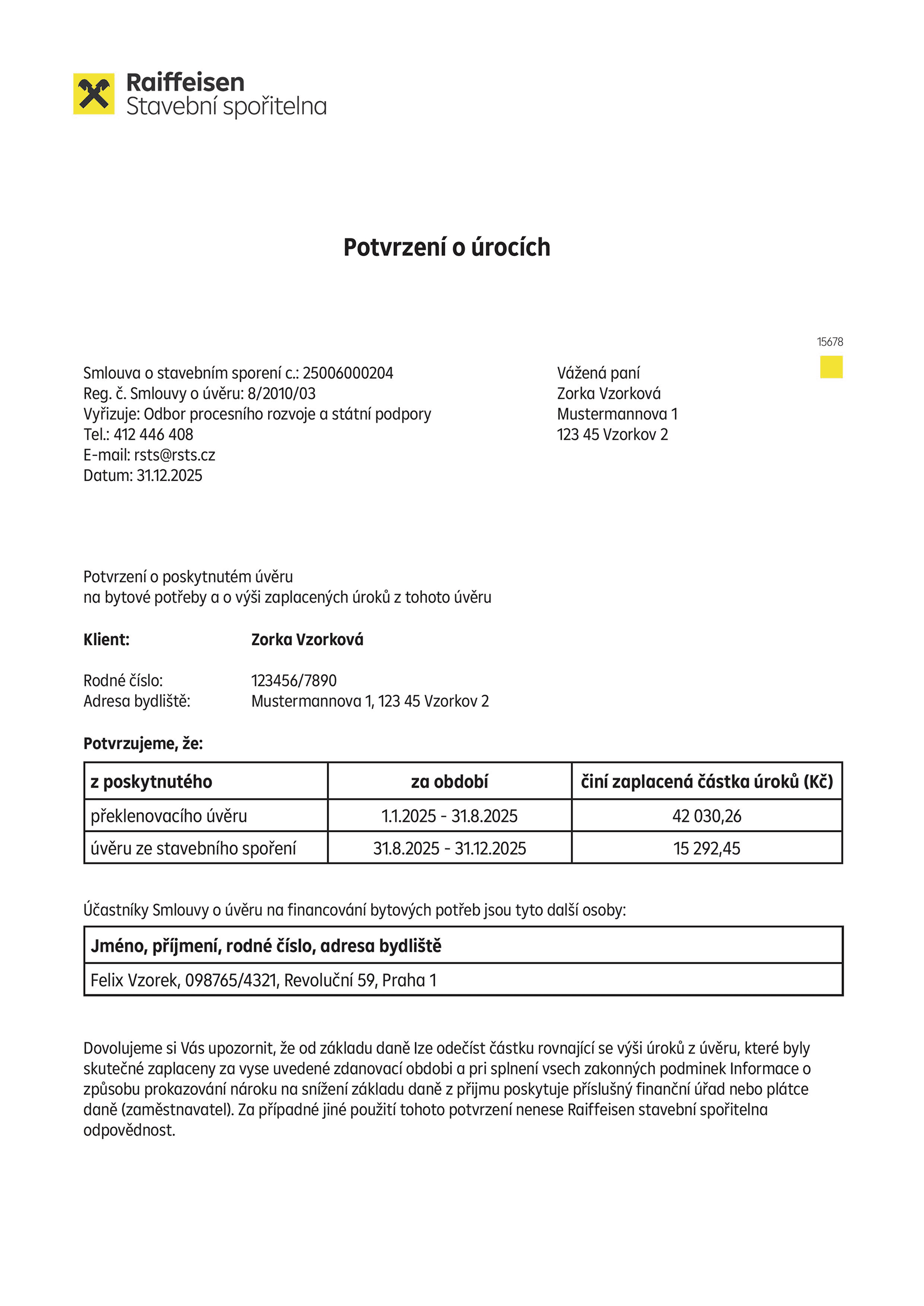 Částka úroků na Potvrzení o poskytnutém úvěru odpovídá úrokům, které byly skutečně zaplaceny za uvedené období. Tyto zaplacené úroky nejsou rovny součtu měsíčních předpisů úroků uváděných na výpisu z účtu překlenovacího úvěru nebo úvěru ze stavebního spoření.