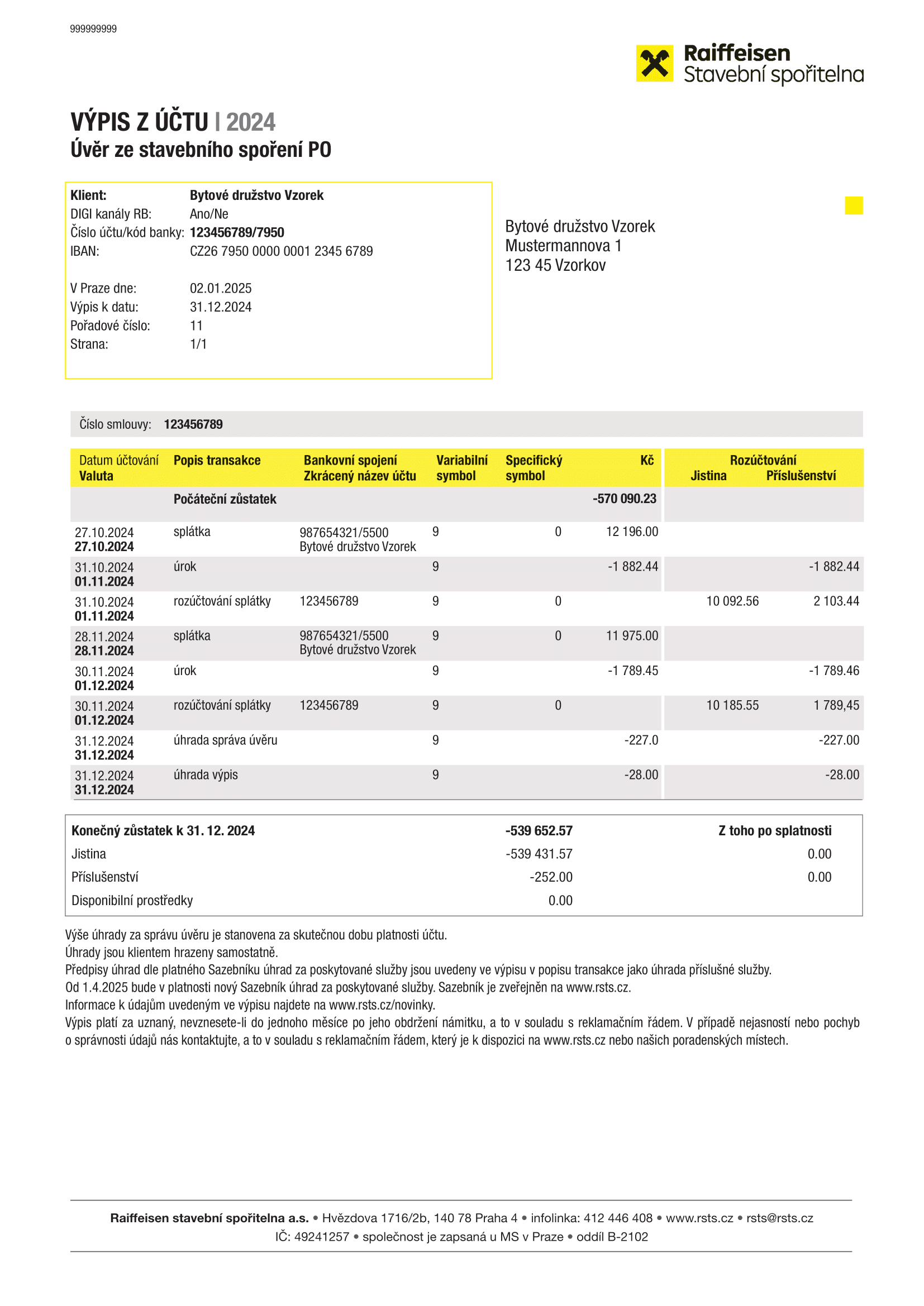 Konečný zůstatek jistiny k datu výpisu z účtu činí 539 431.57 Kč.